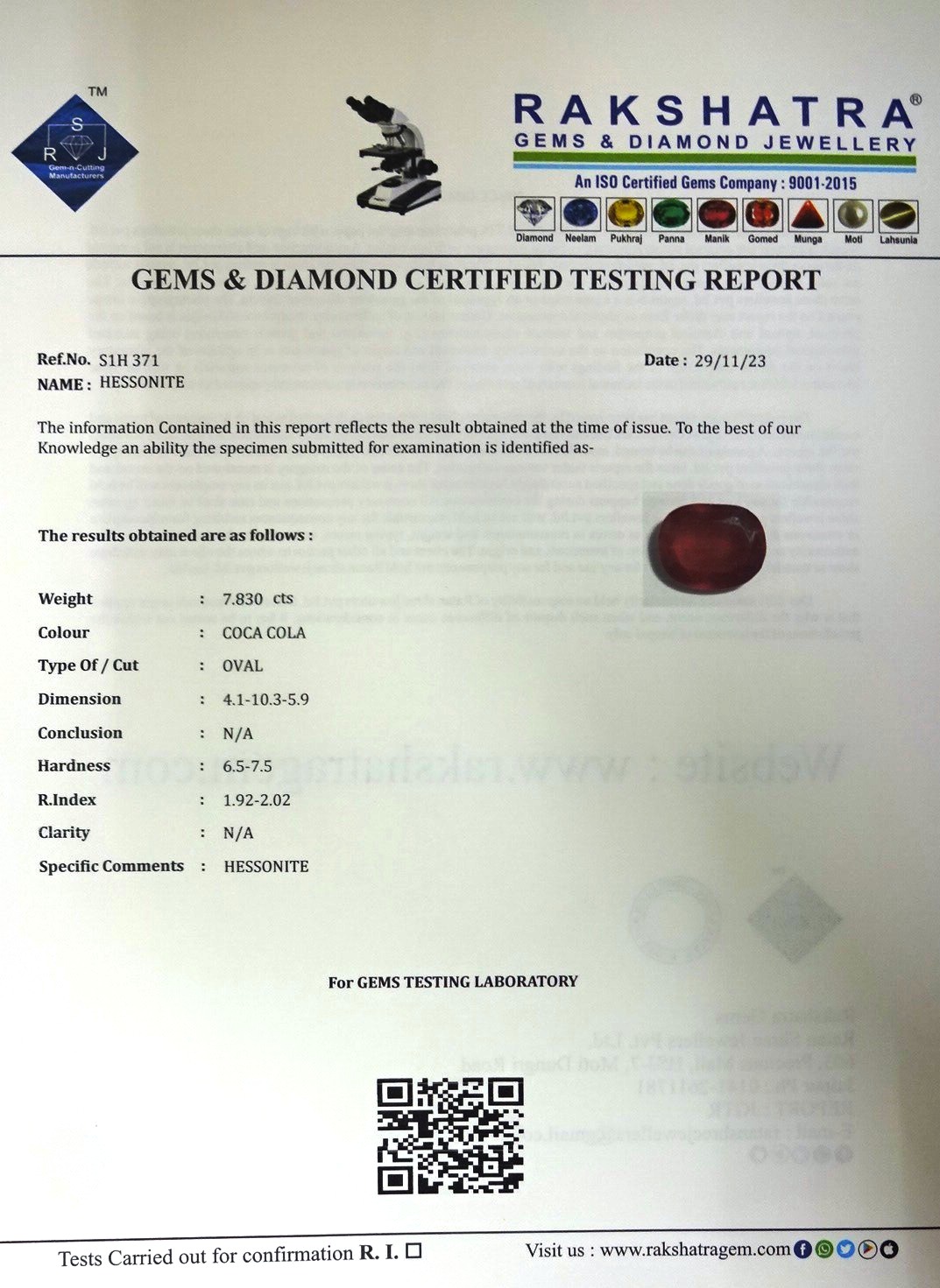 | SPECIFIC COMMENTS: | HESSONITE |