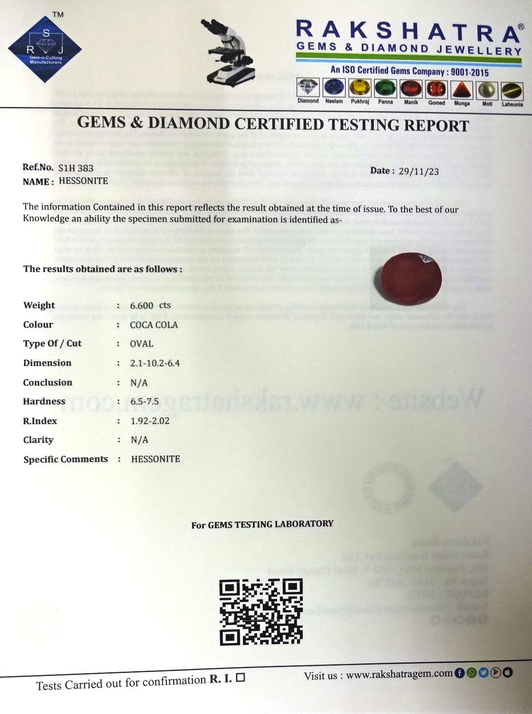 | SPECIFIC COMMENTS: | HESSONITE |