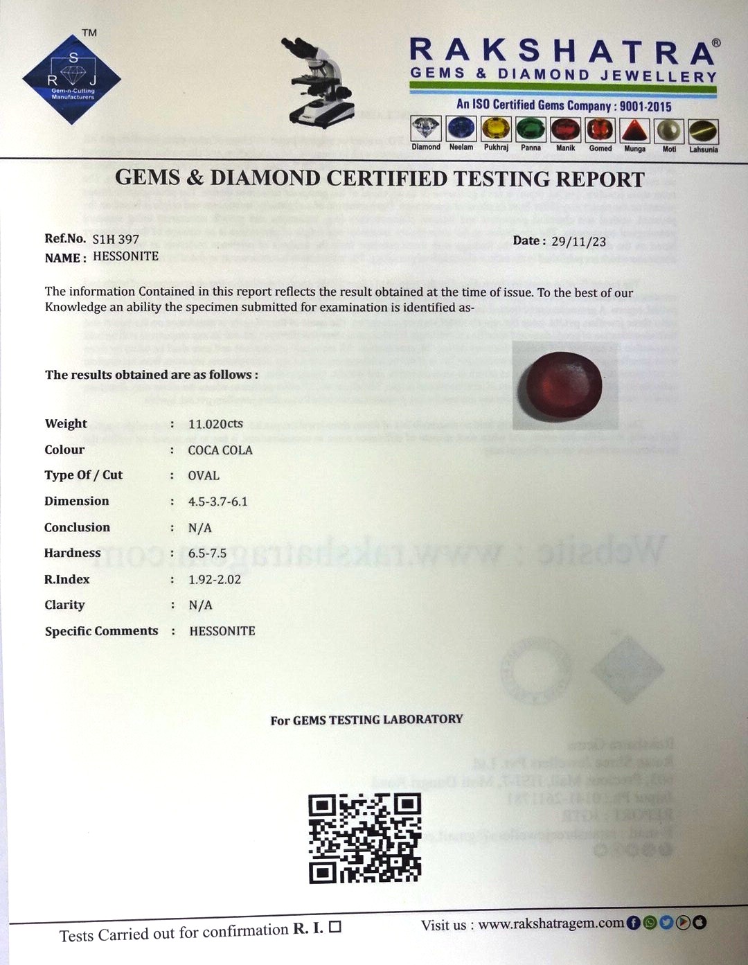 | SPECIFIC COMMENTS: | HESSONITE |