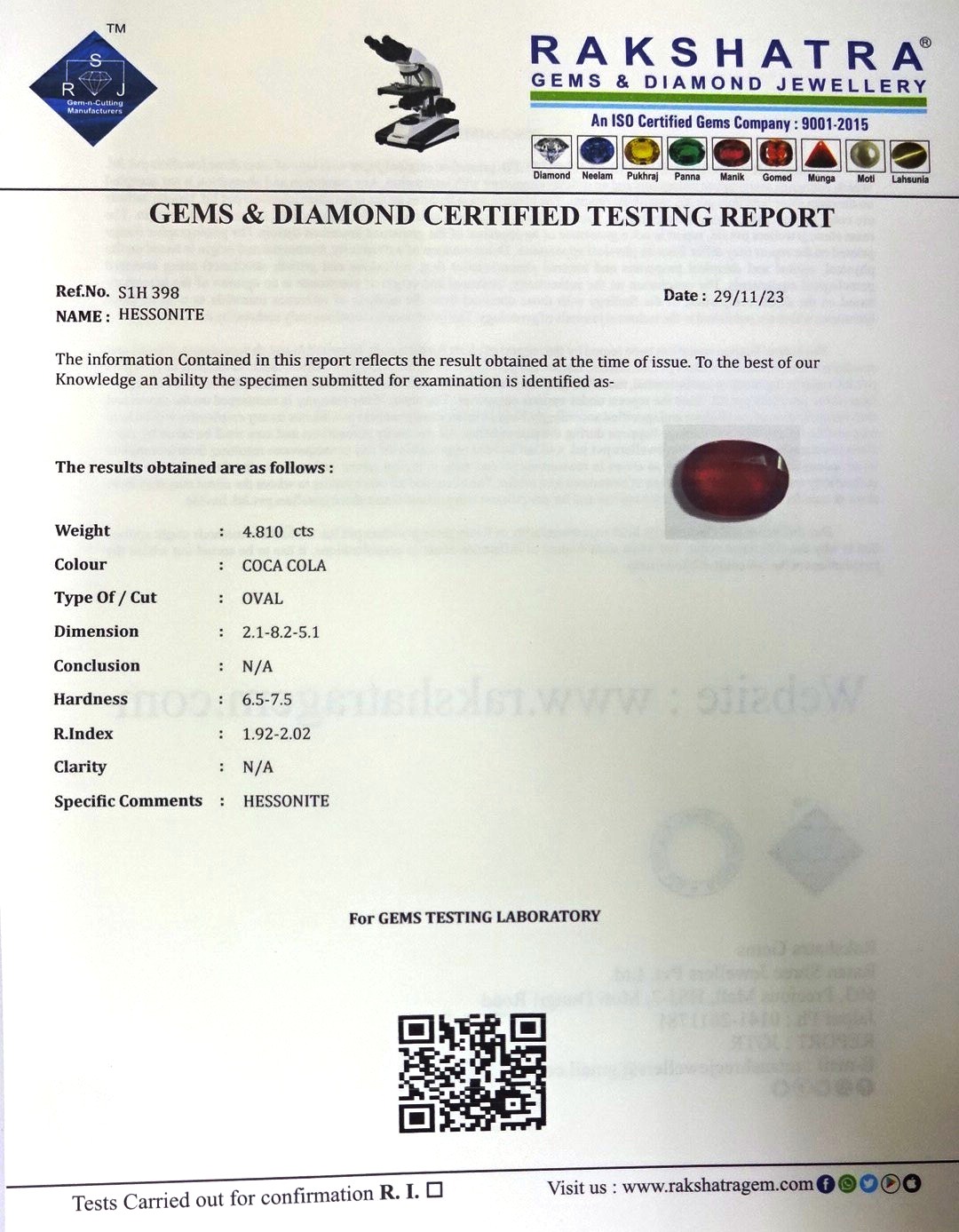 | SPECIFIC COMMENTS: | HESSONITE |