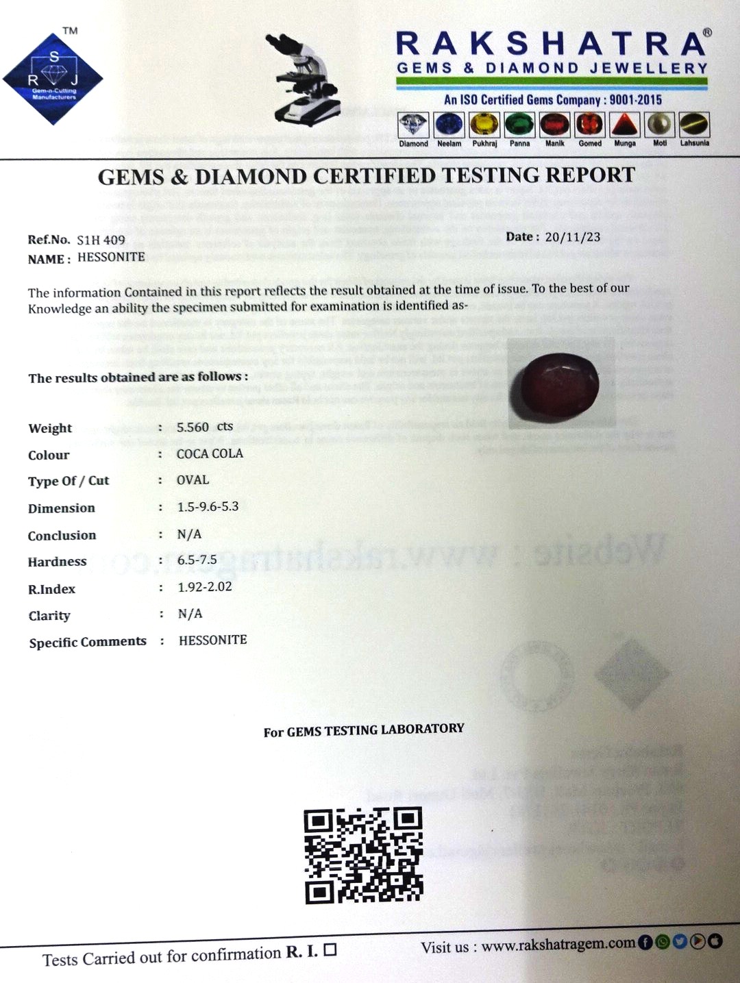 | SPECIFIC COMMENTS: | HESSONITE |