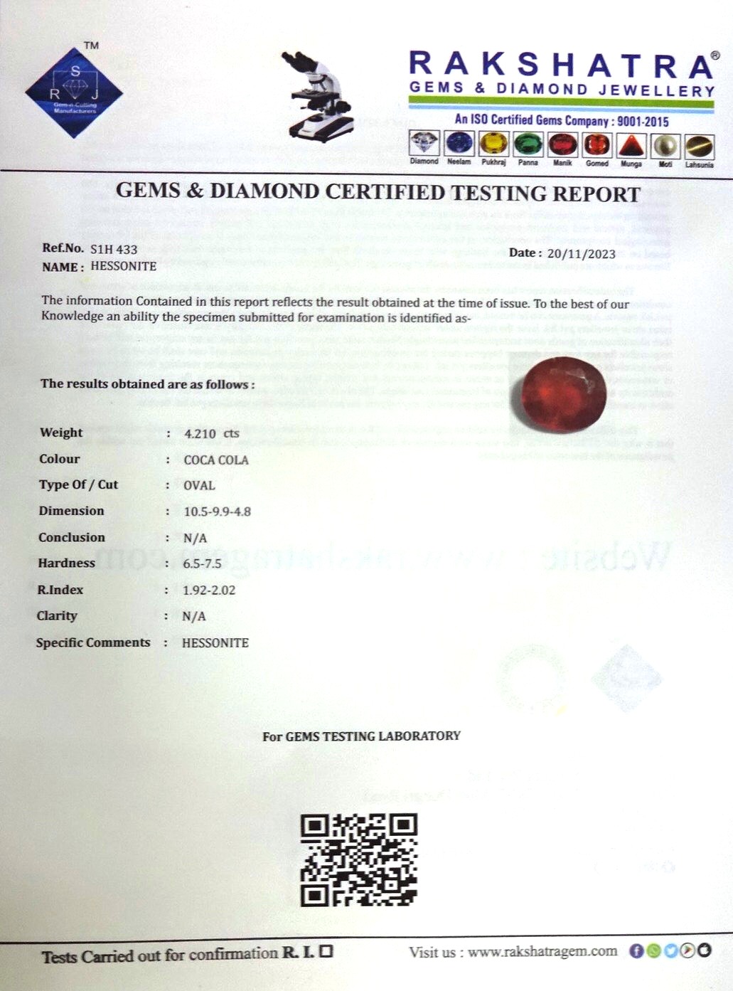 | SPECIFIC COMMENTS: | HESSONITE |