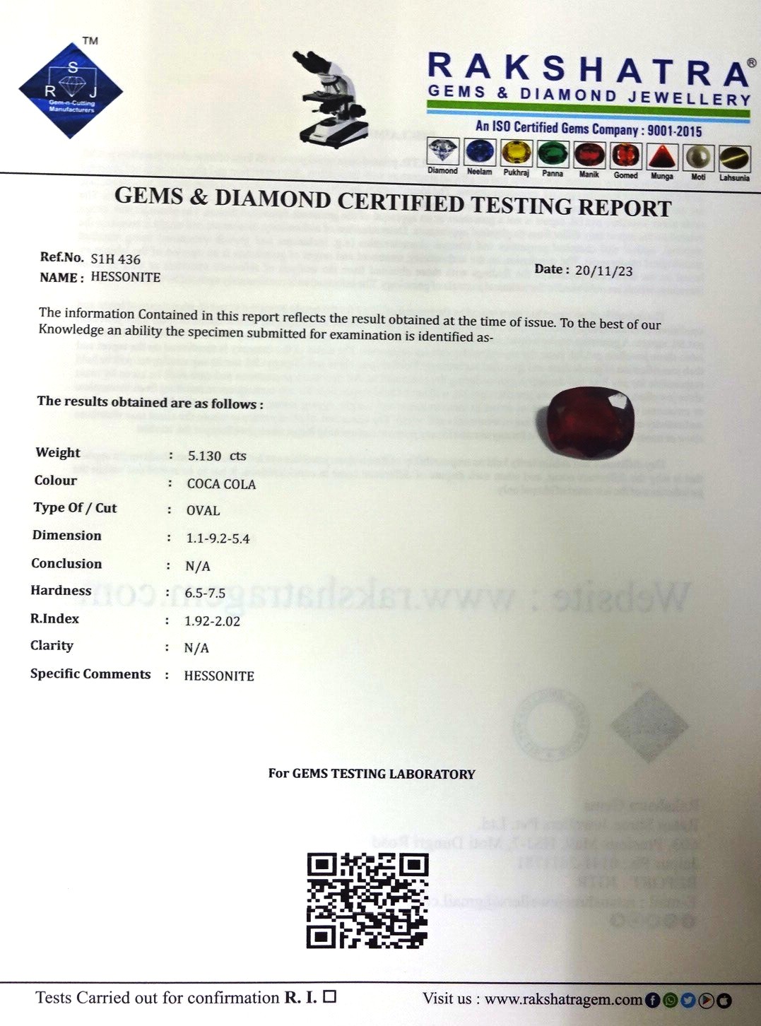 | SPECIFIC COMMENTS: | HESSONITE |