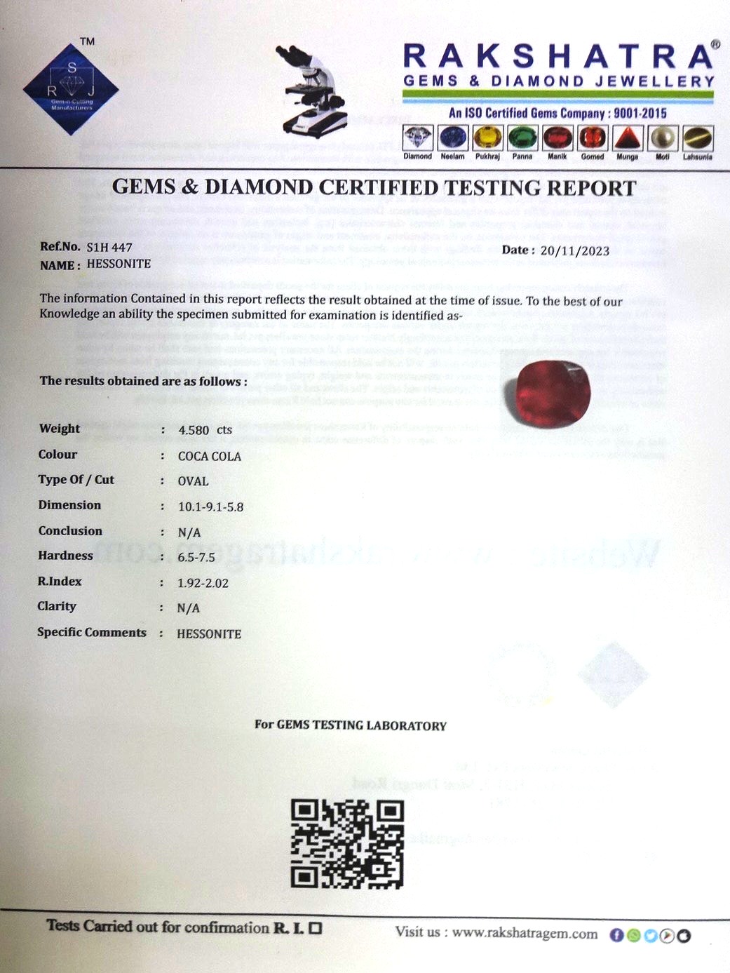 | SPECIFIC COMMENTS: | HESSONITE |