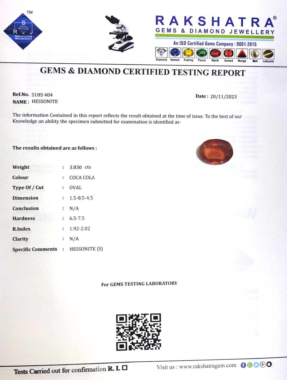 | SPECIFIC COMMENTS: | HESSONITE {S} |