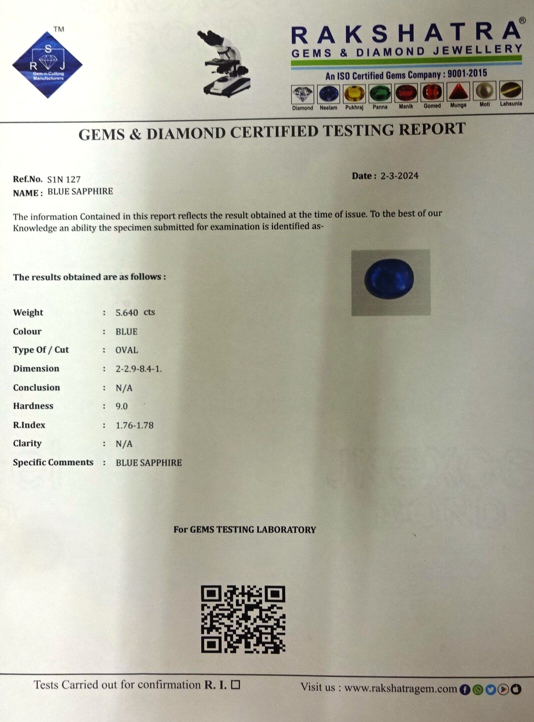 | SPECIFIC COMMENTS: | BLUE SAPPHIRE |