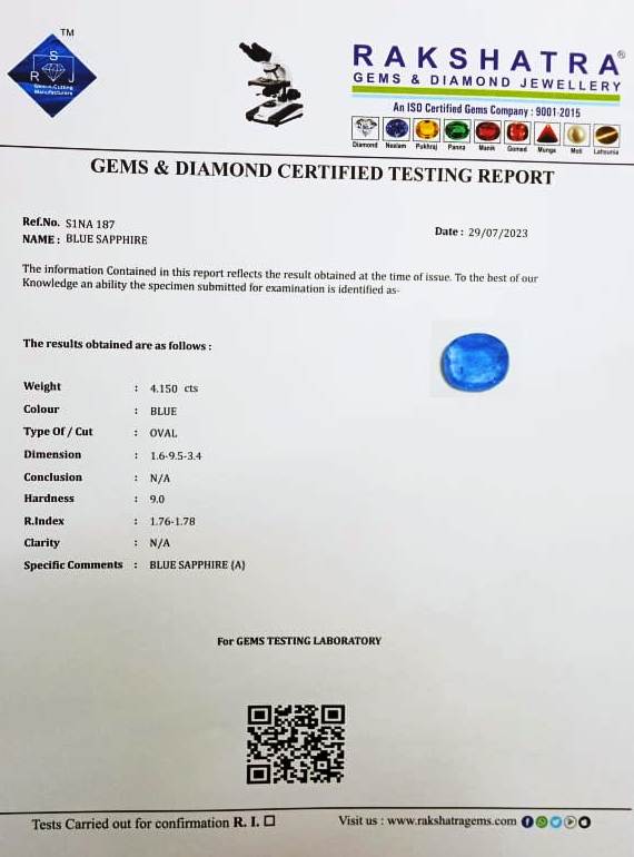 | SPECIFIC COMMENTS: | BLUE SAPPHIRE {A} |