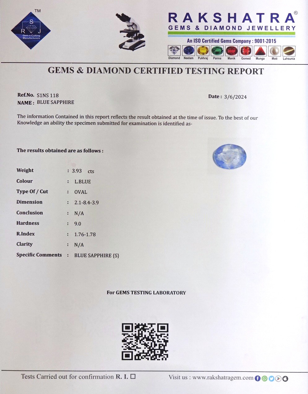 | SPECIFIC COMMENTS: | BLUE SAPPHIRE {S} |