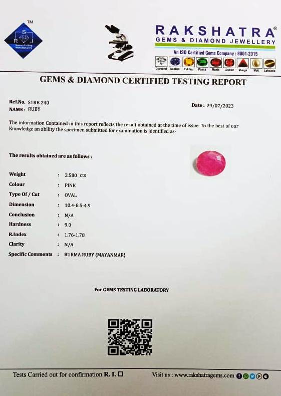 | SPECIFIC COMMENTS: | BURMA RUBY {MAYANMAR} |