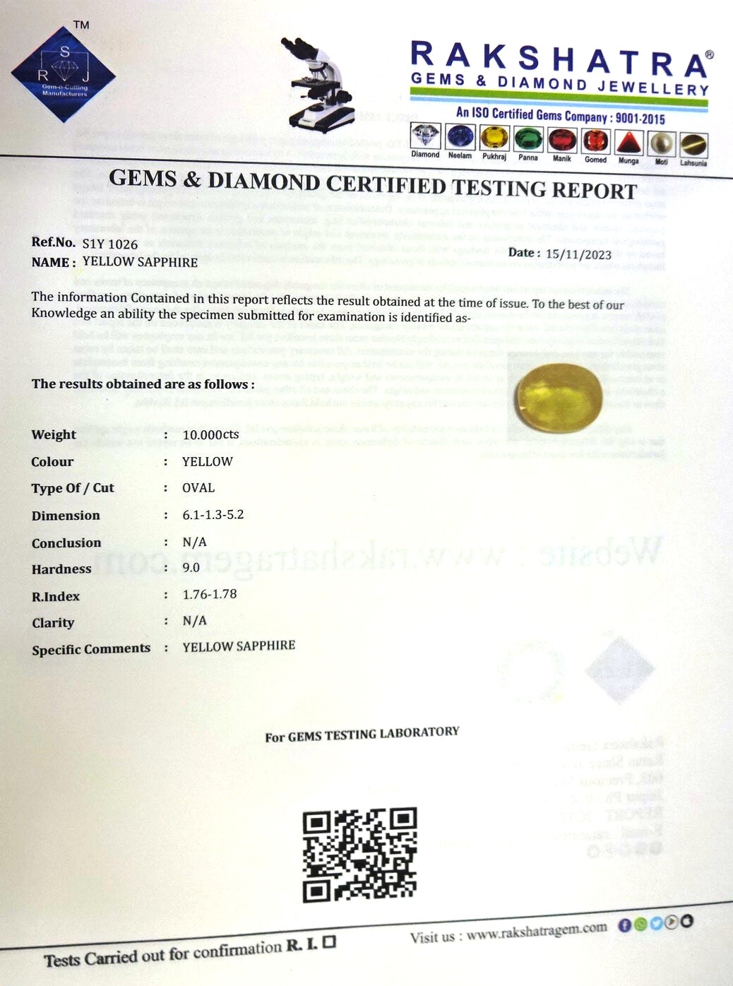| SPECIFIC COMMENTS: | YELLOW SAPPHIRE |