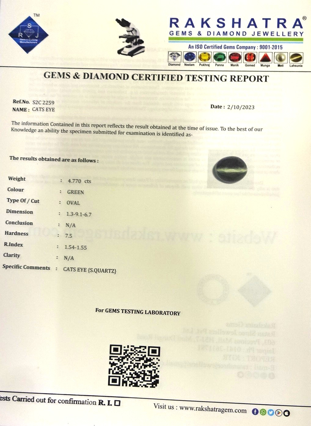 | SPECIFIC COMMENTS: | CATS EYE {S.QUARTZ} |