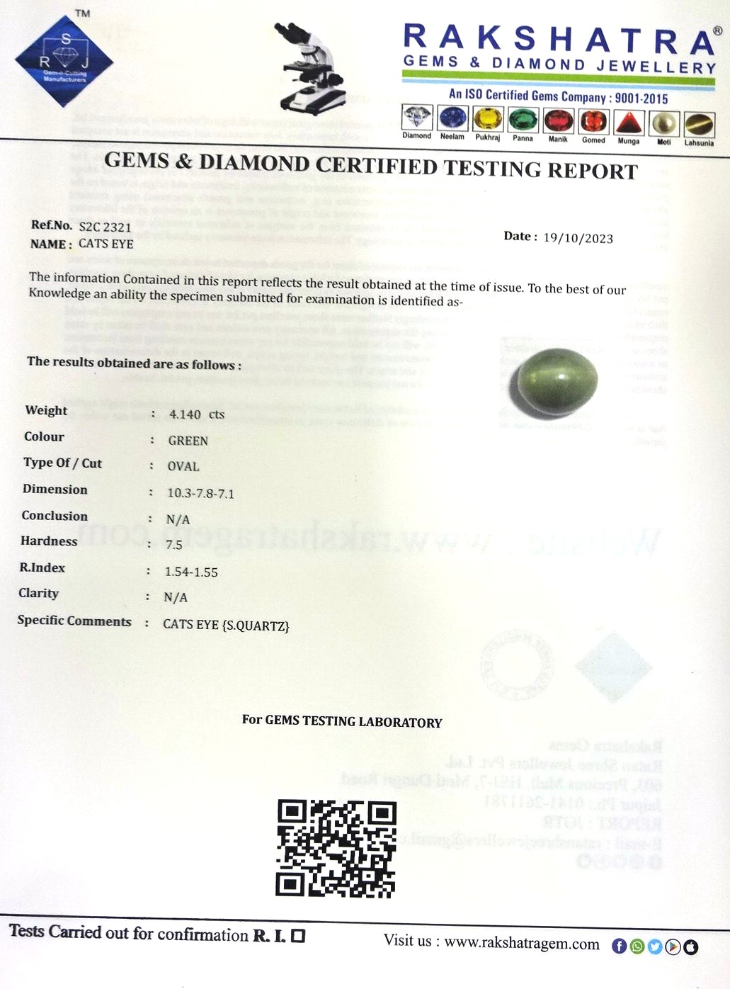 | SPECIFIC COMMENTS: | CATS EYE { S . QUARTZ } |