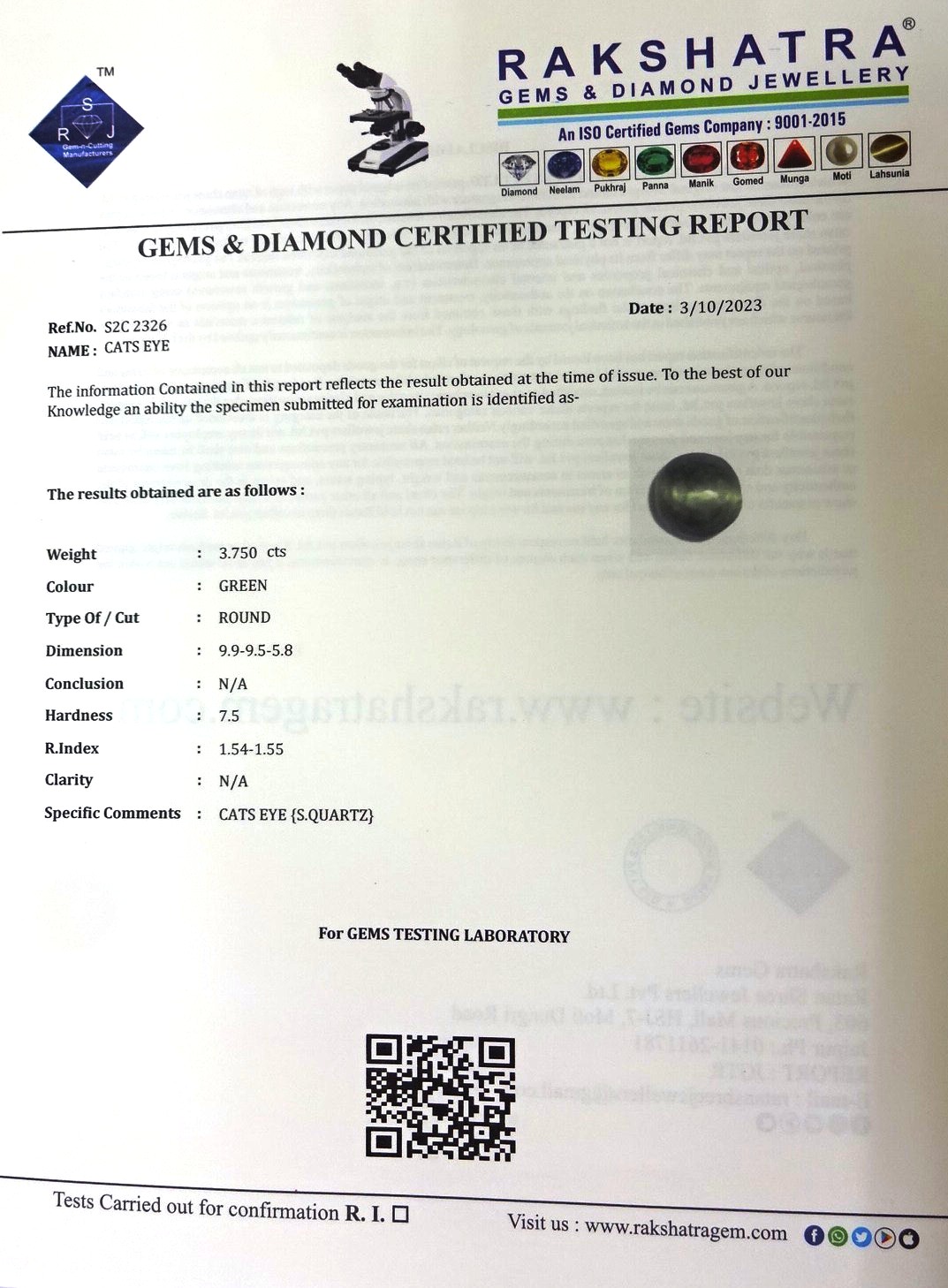 | SPECIFIC COMMENTS: | CATS EYE { S . QUARTZ }  |