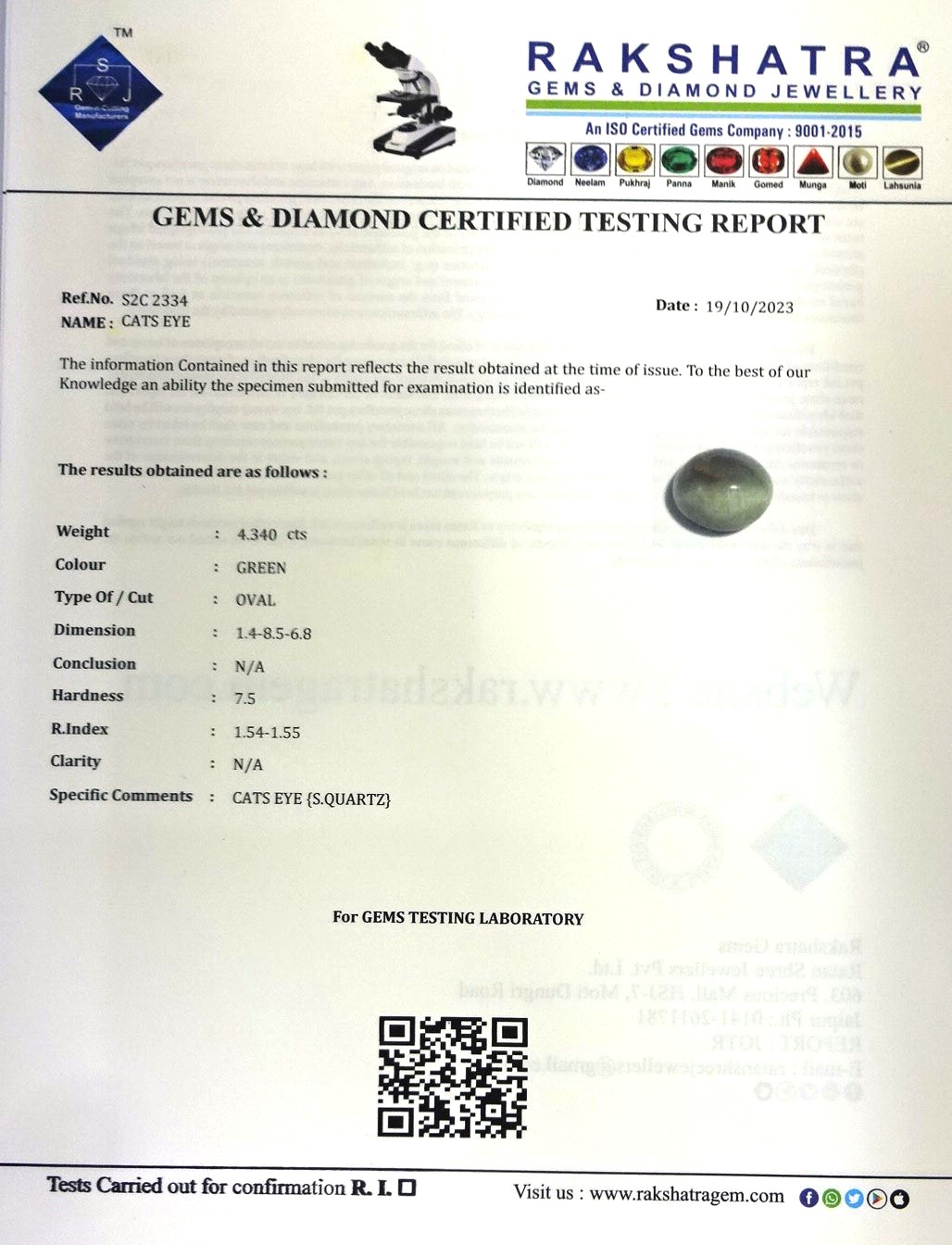 | SPECIFIC COMMENTS: | CATS EYE {S.QUARTZ}  |