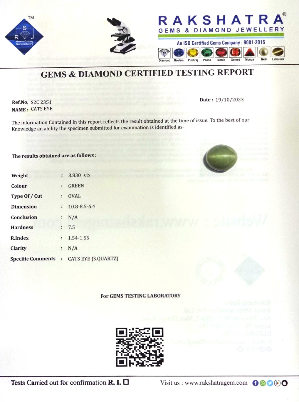 | SPECIFIC COMMENTS: | CATS EYE { S . QUARTZ } |