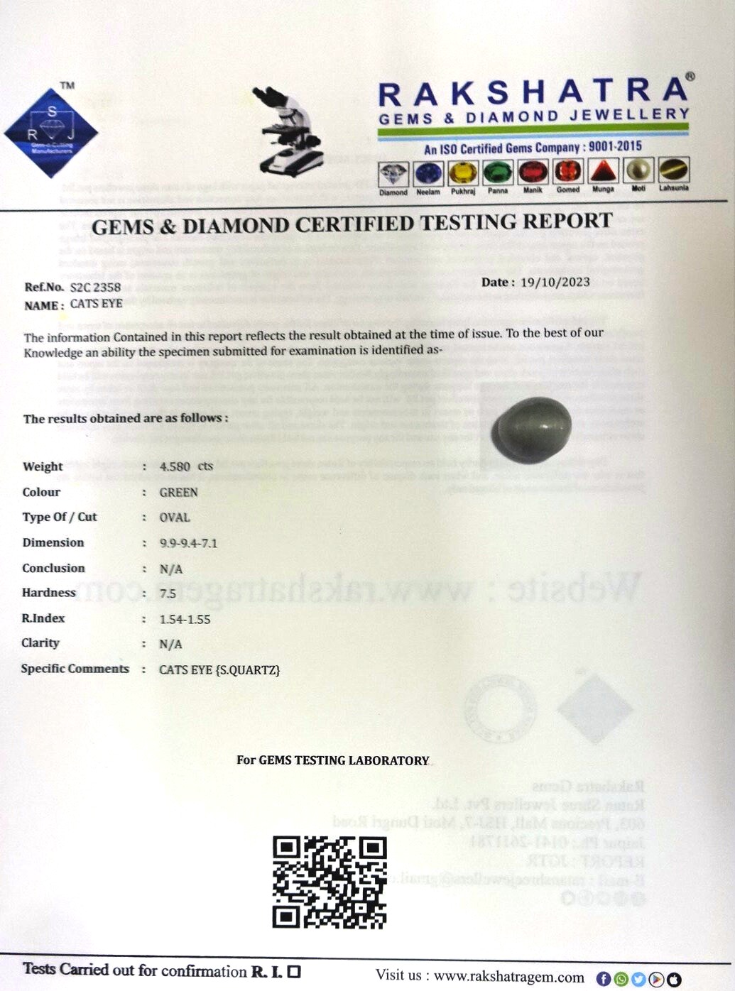 | SPECIFIC COMMENTS: | CATS EYE { S . QUARTZ } |