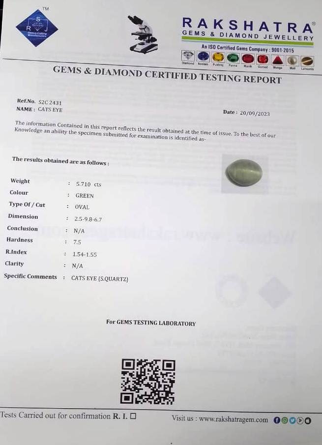 | SPECIFIC COMMENTS: | CATS EYE {S.QUARTZ} |