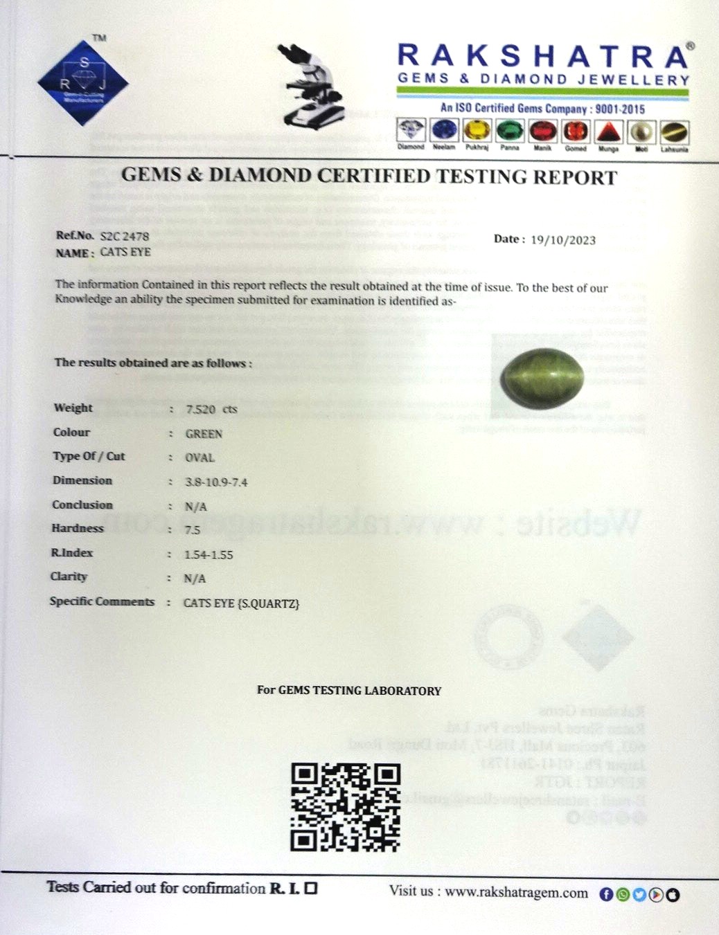 | SPECIFIC COMMENTS: | CATS EYE {S.QUARTZ} |