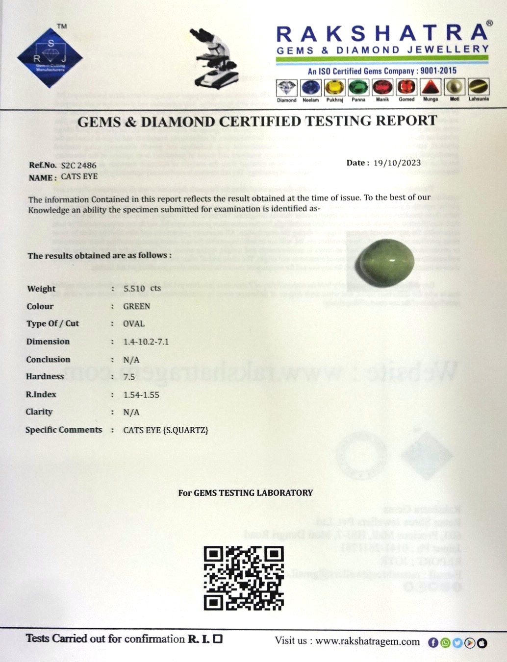 | SPECIFIC COMMENTS: | CATS EYE {S.QUARTZ} |