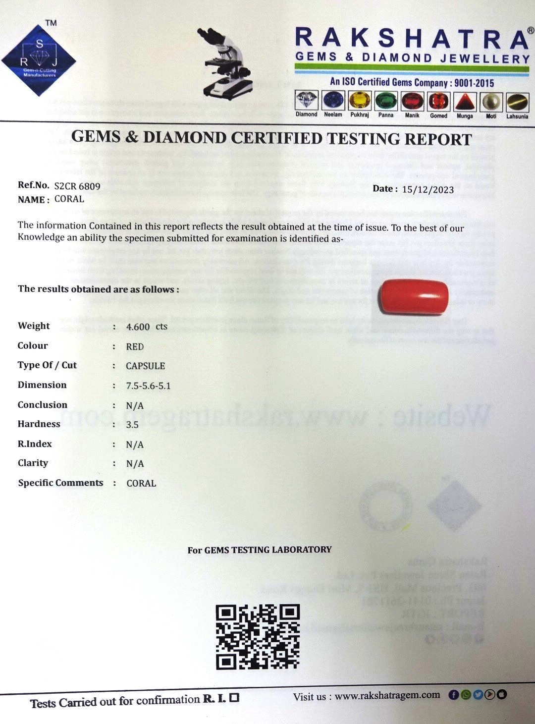 | WEIGHT: | 4.60 CTS |