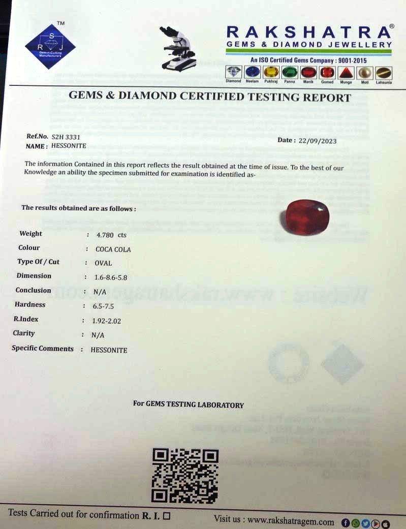 | SPECIFIC COMMENTS: | HESSONITE |