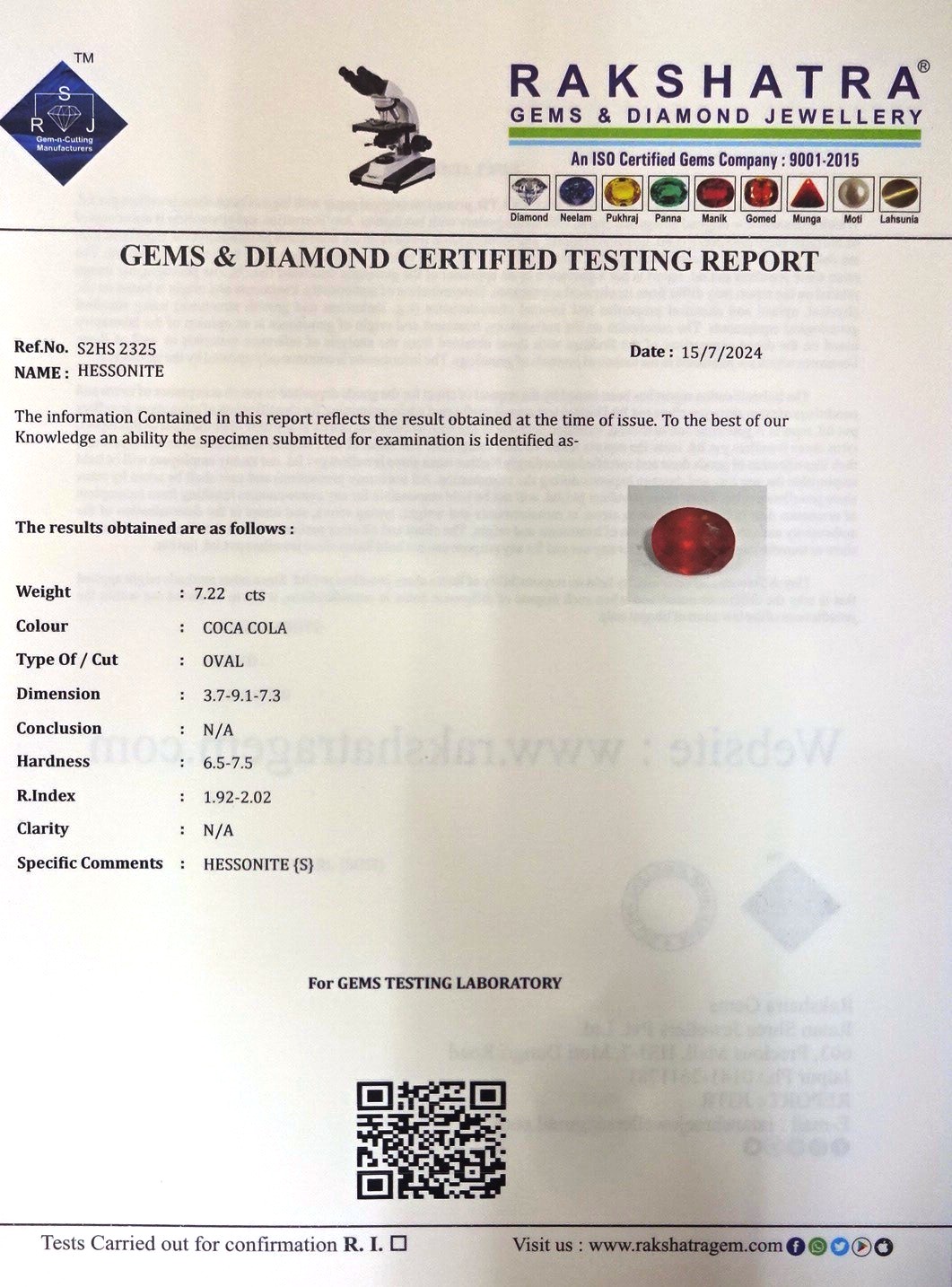 | SPECIFIC COMMENTS: | HESSONITE {S} |