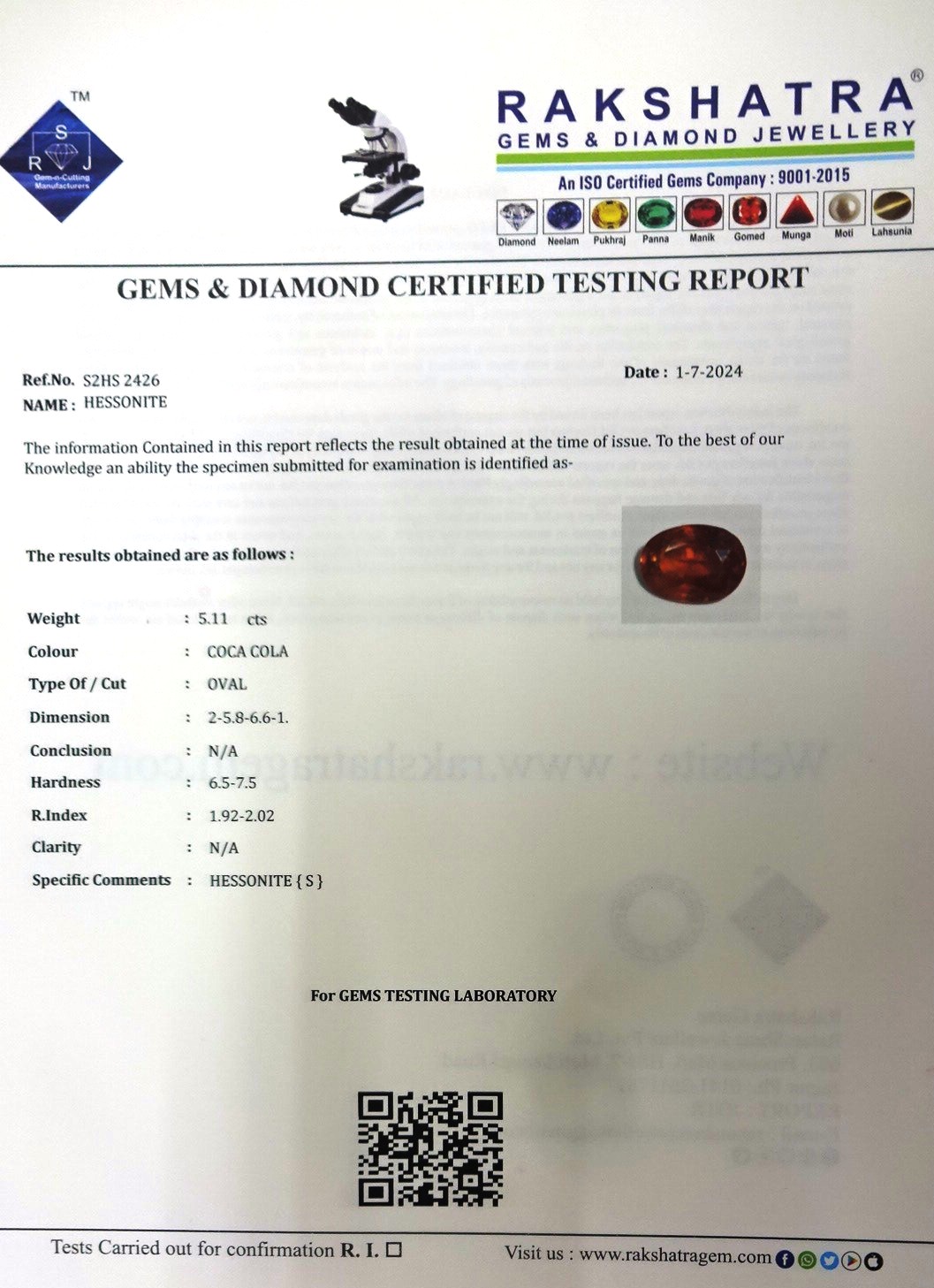 | SPECIFIC COMMENTS: | HESSONITE {S} |