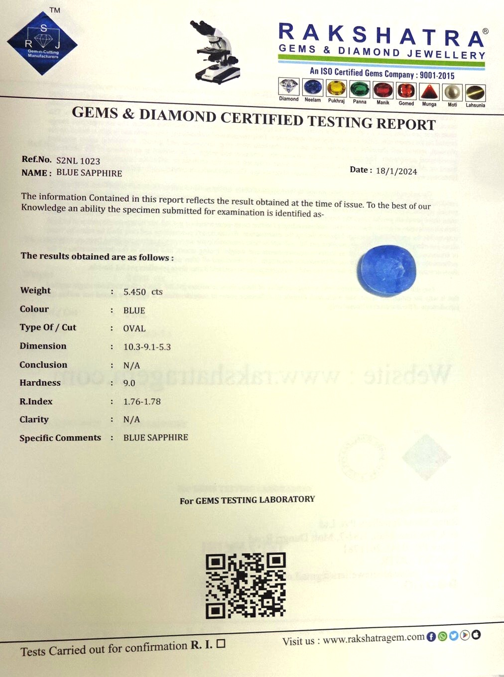 | SPECIFIC COMMENTS: | BLUE SAPPHIRE |