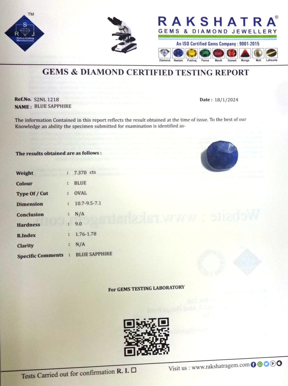 | SPECIFIC COMMENTS: | BLUE SAPPHIRE |