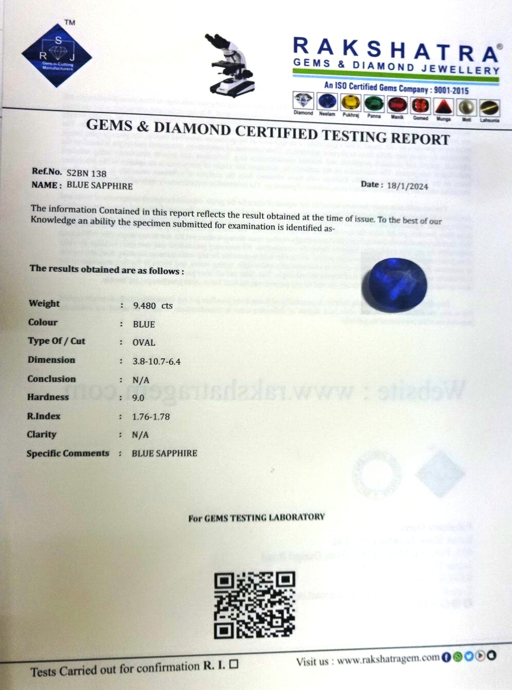 | SPECIFIC COMMENTS: | BLUE SAPPHIRE |