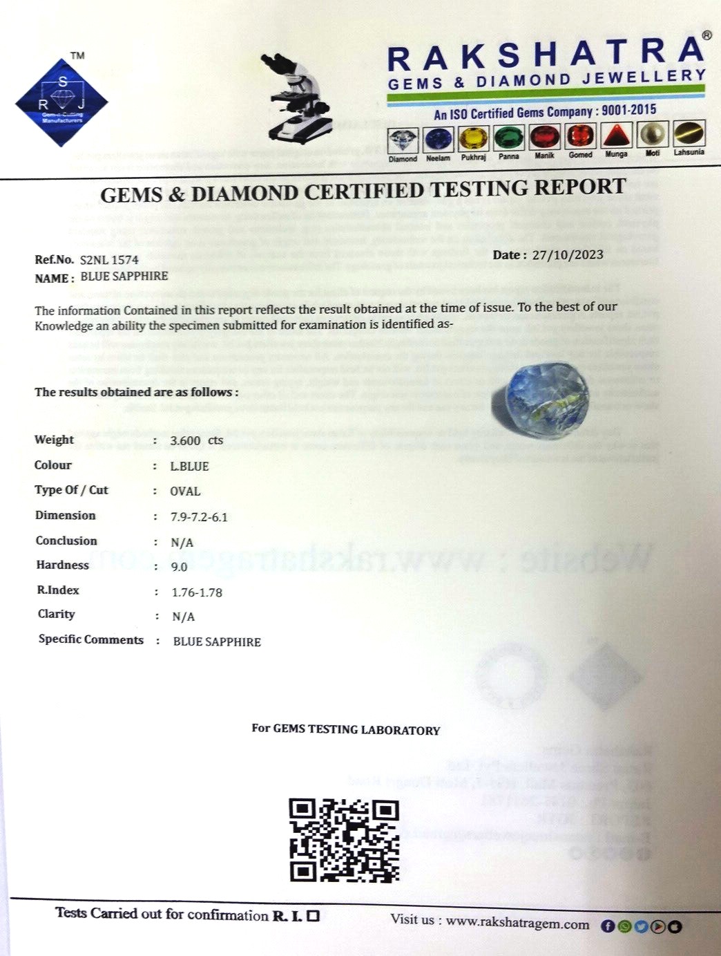 | SPECIFIC COMMENTS: | BLUE SAPPHIRE |