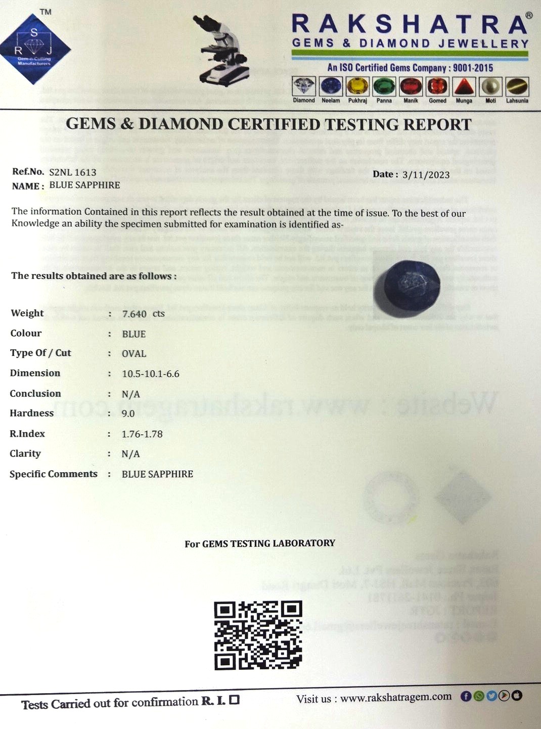 | SPECIFIC COMMENTS: | BLUE SAPPHIRE |
