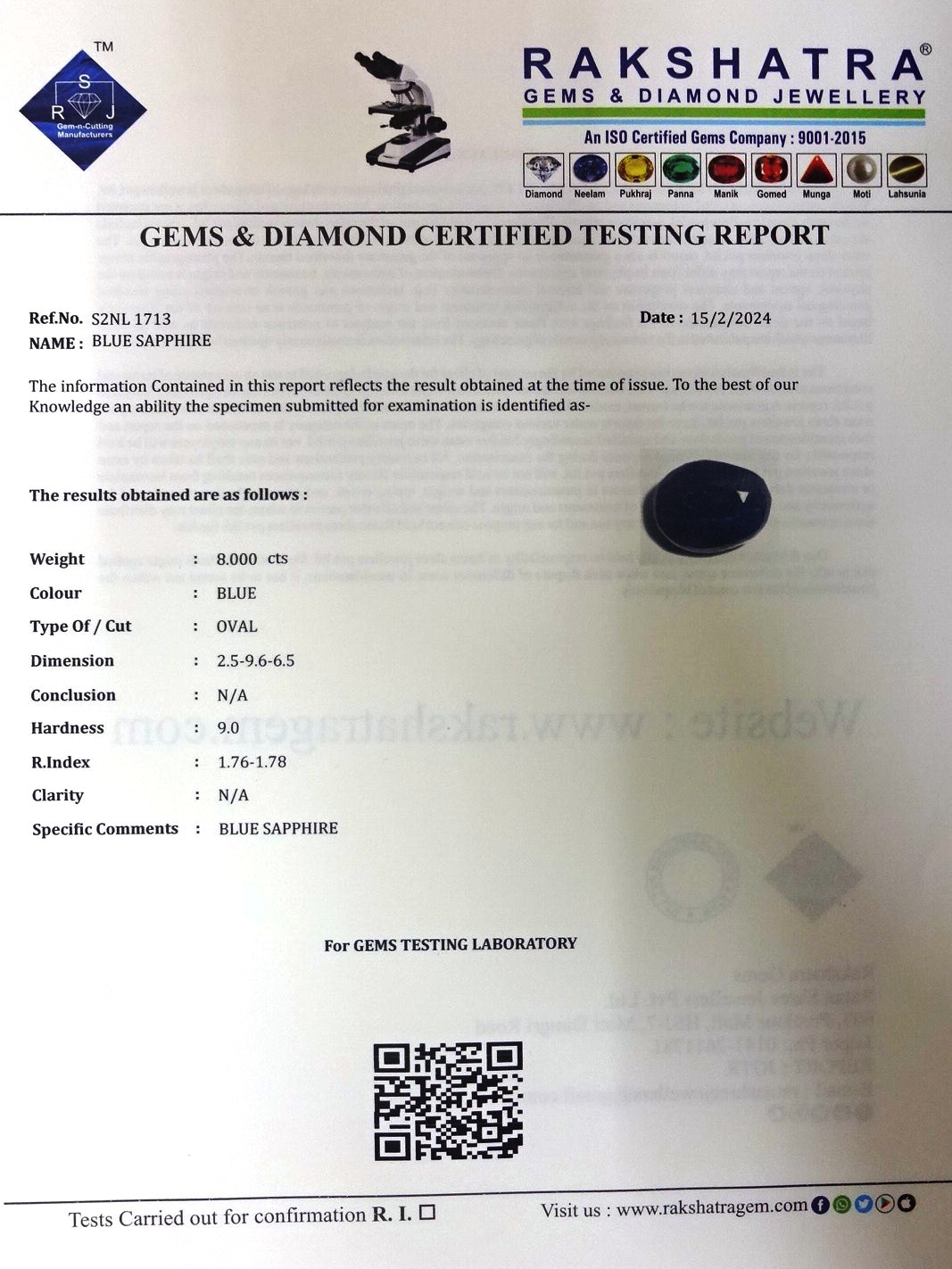 | SPECIFIC COMMENTS: | BLUE SAPPHIRE |
