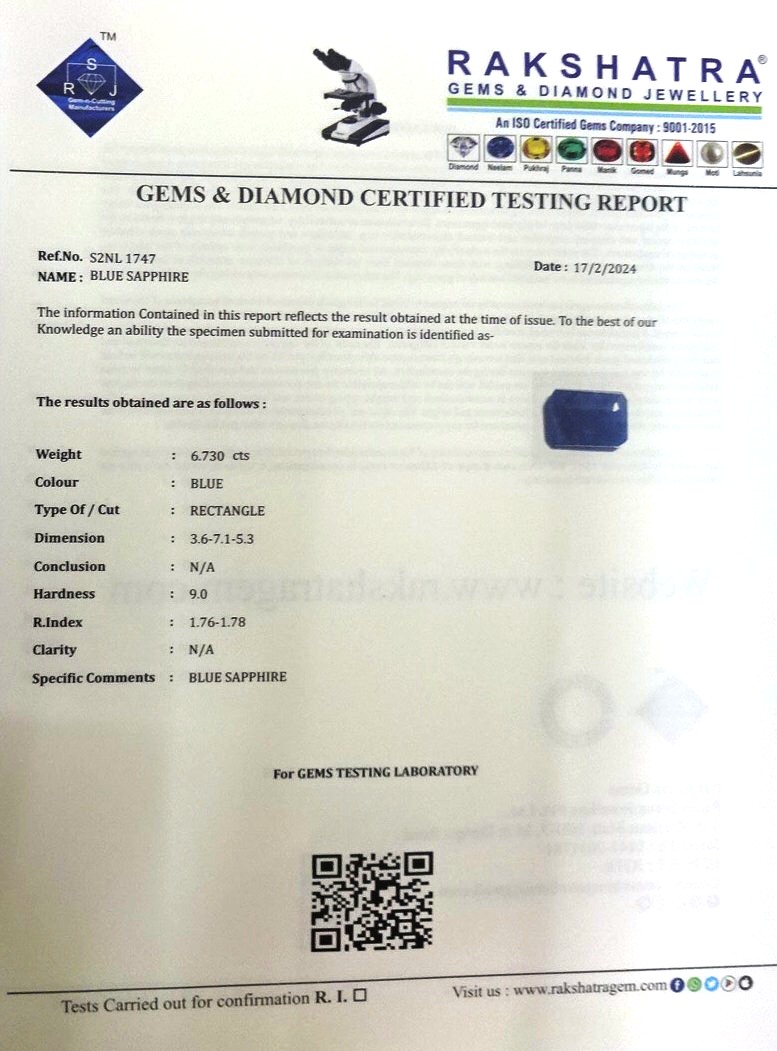 | SPECIFIC COMMENTS: | BLUE SAPPHIRE |