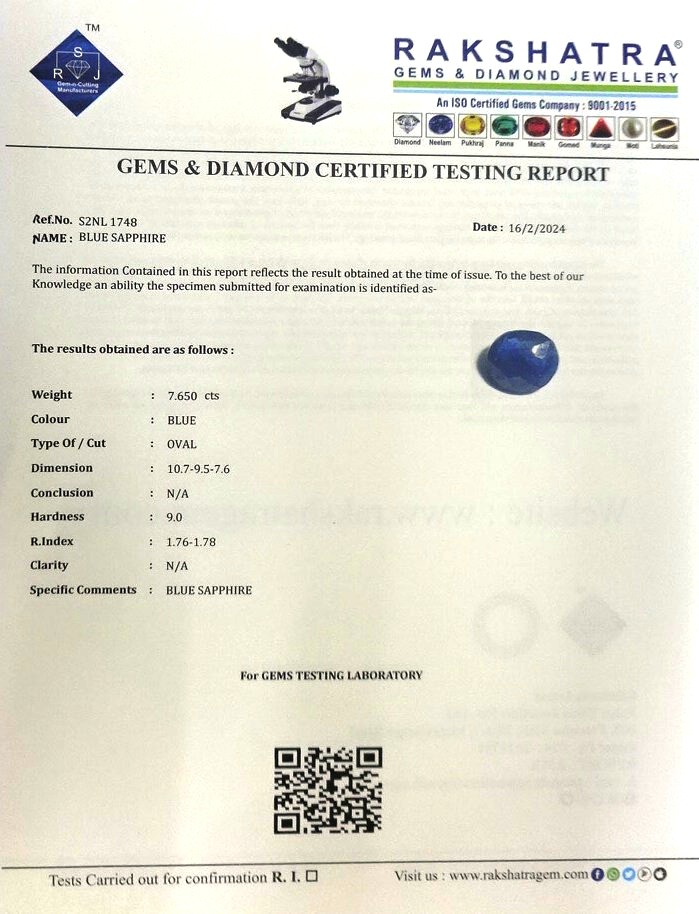 | SPECIFIC COMMENTS: | BLUE SAPPHIRE |