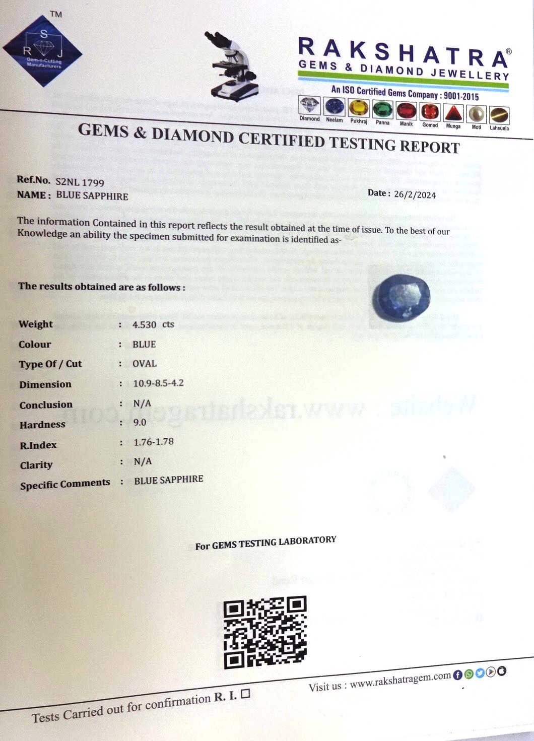| SPECIFIC COMMENTS: | BLUE SAPPHIRE |
