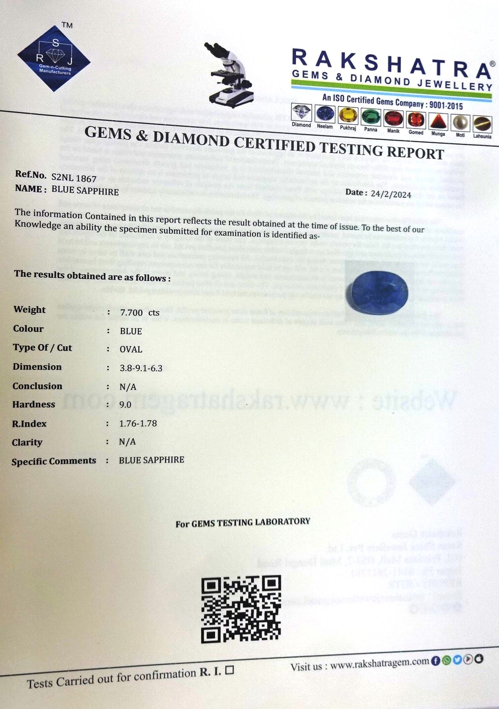 | SPECIFIC COMMENTS: | BLUE SAPPHIRE |