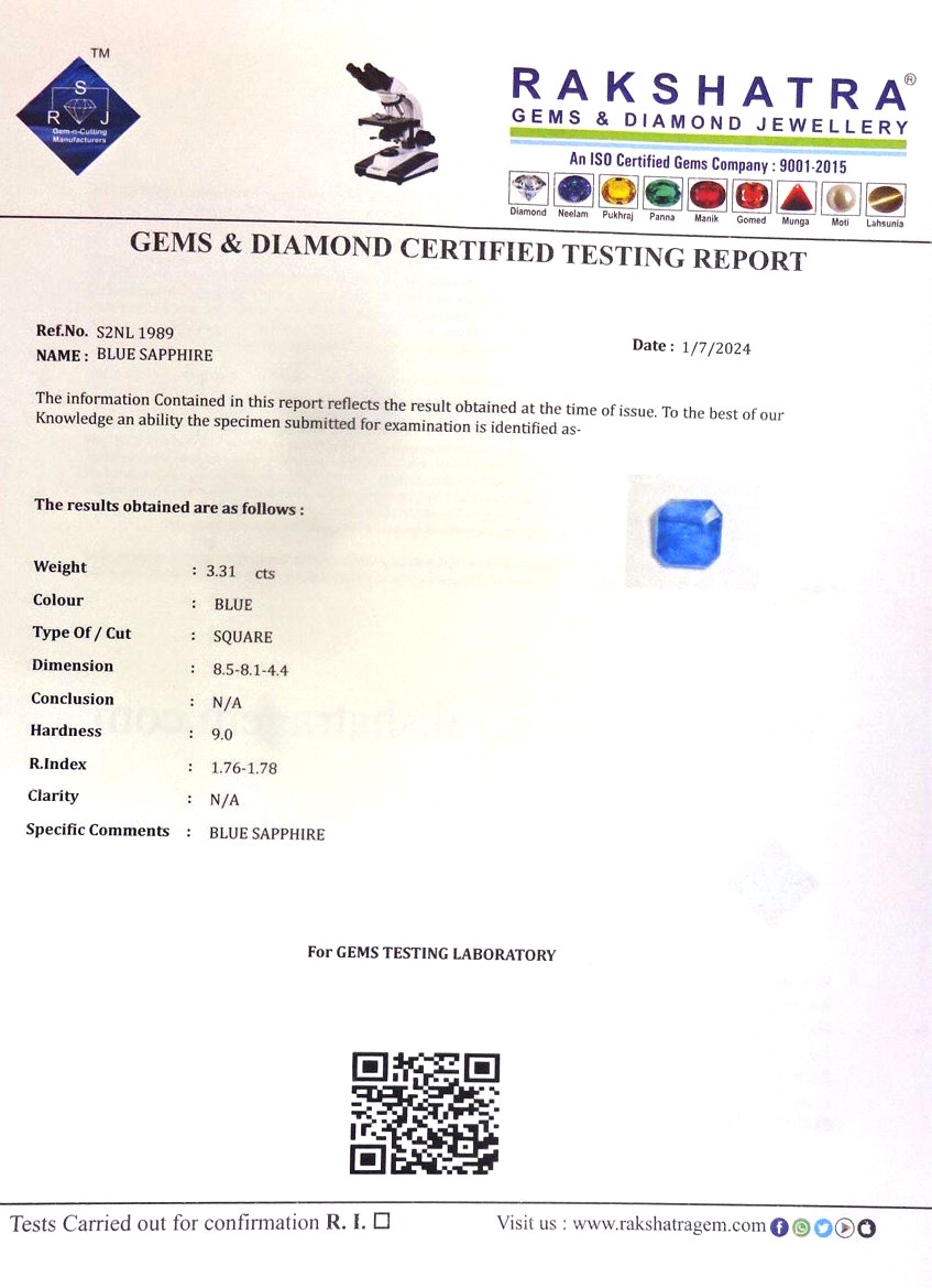 | SPECIFIC COMMENTS: | BLUE SAPPHIRE |