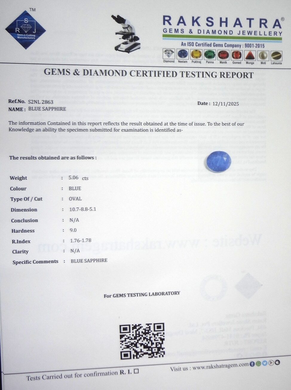 | SPECIFIC COMMENTS: | BLUE SAPPHIRE |