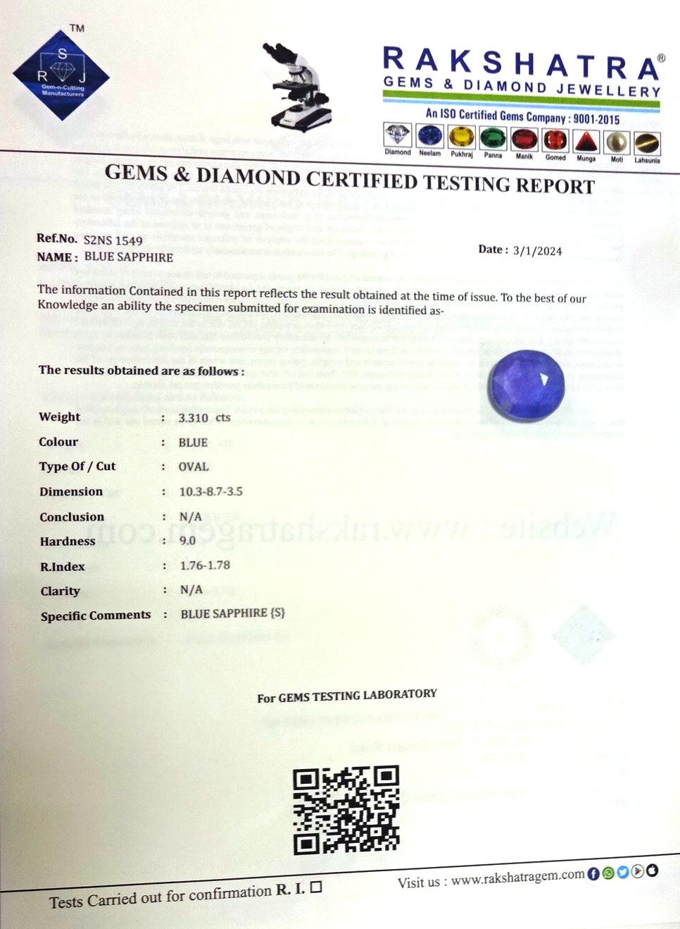 | SPECIFIC COMMENTS: | BLUE SAPPHIRE { S } |
