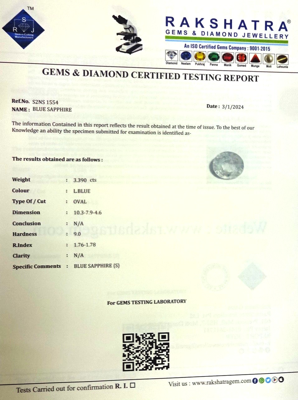 | SPECIFIC COMMENTS: | BLUE SAPPHIRE { S } |