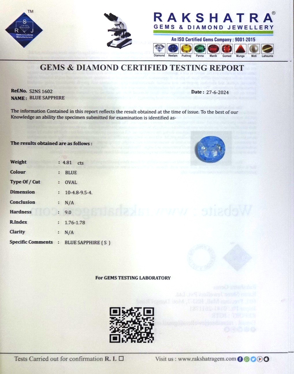 | SPECIFIC COMMENTS: | BLUE SAPPHIRE {S} |