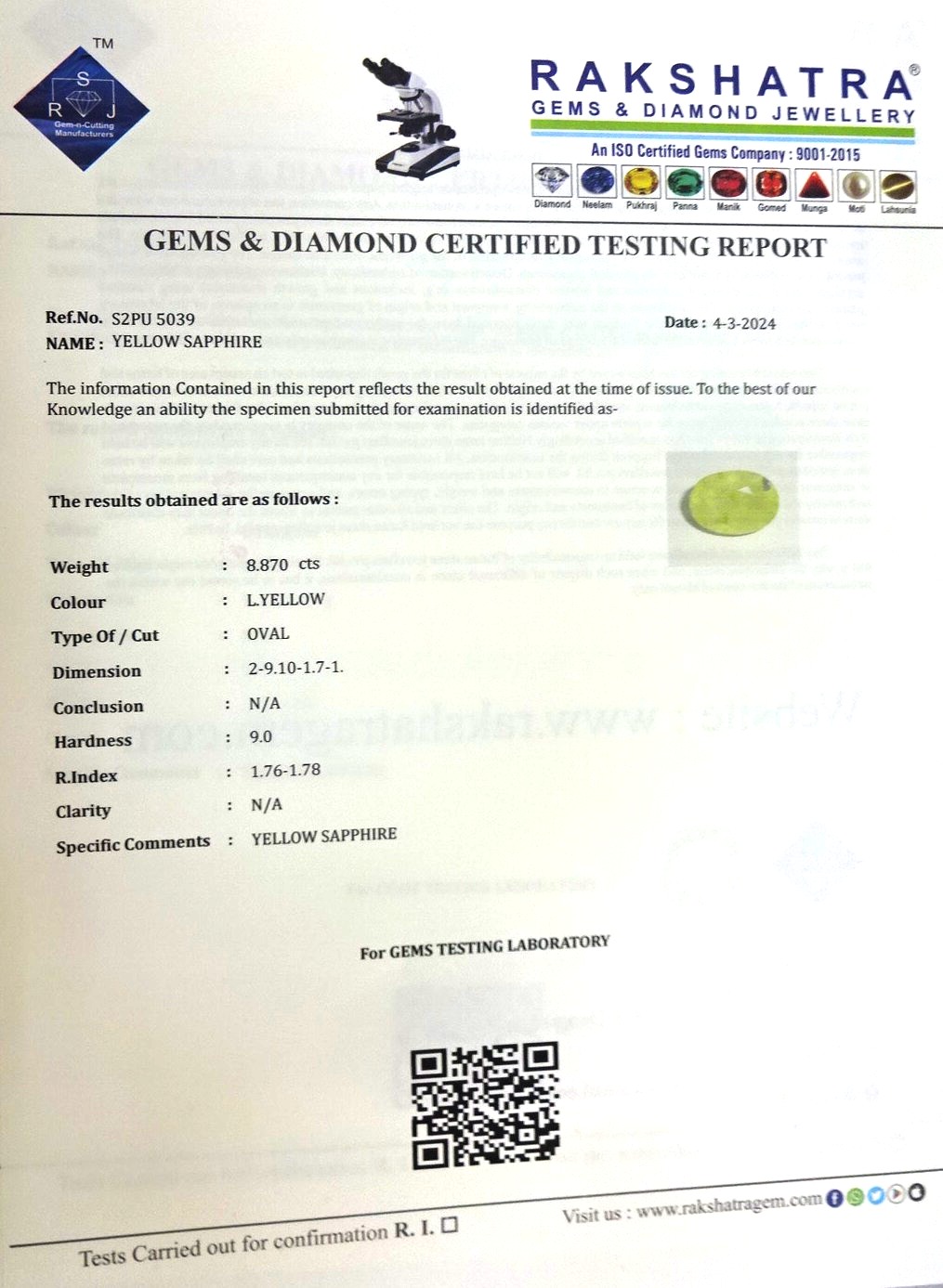 | SPECIFIC COMMENTS: | YELLOW SAPPHIRE |