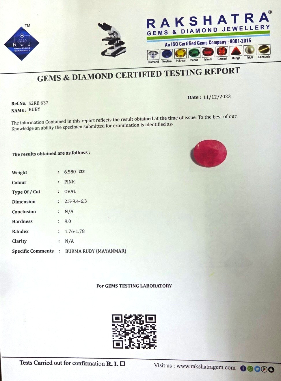 | SPECIFIC COMMENTS: | BURMA RUBY { MAYANMAR } |