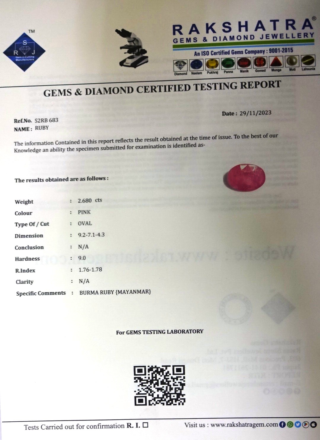 | SPECIFIC COMMENTS: | BURMA RUBY {MAYANMAR} |