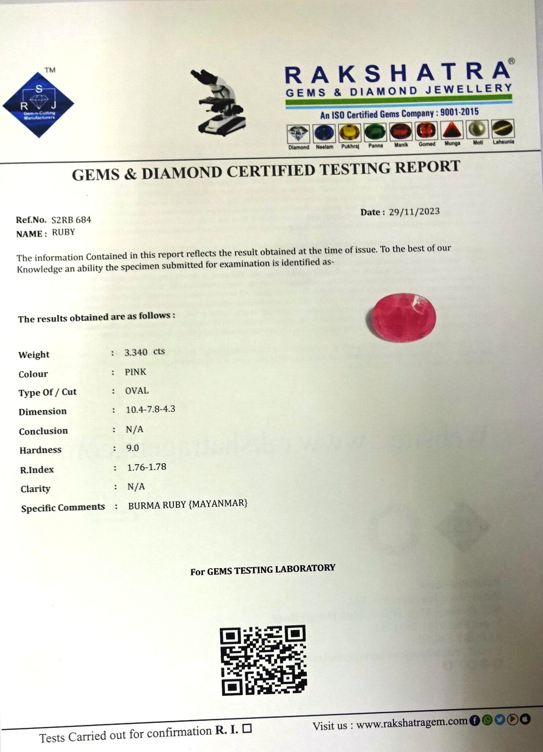 | SPECIFIC COMMENTS: | BURMA RUBY {MAYANMAR}  |