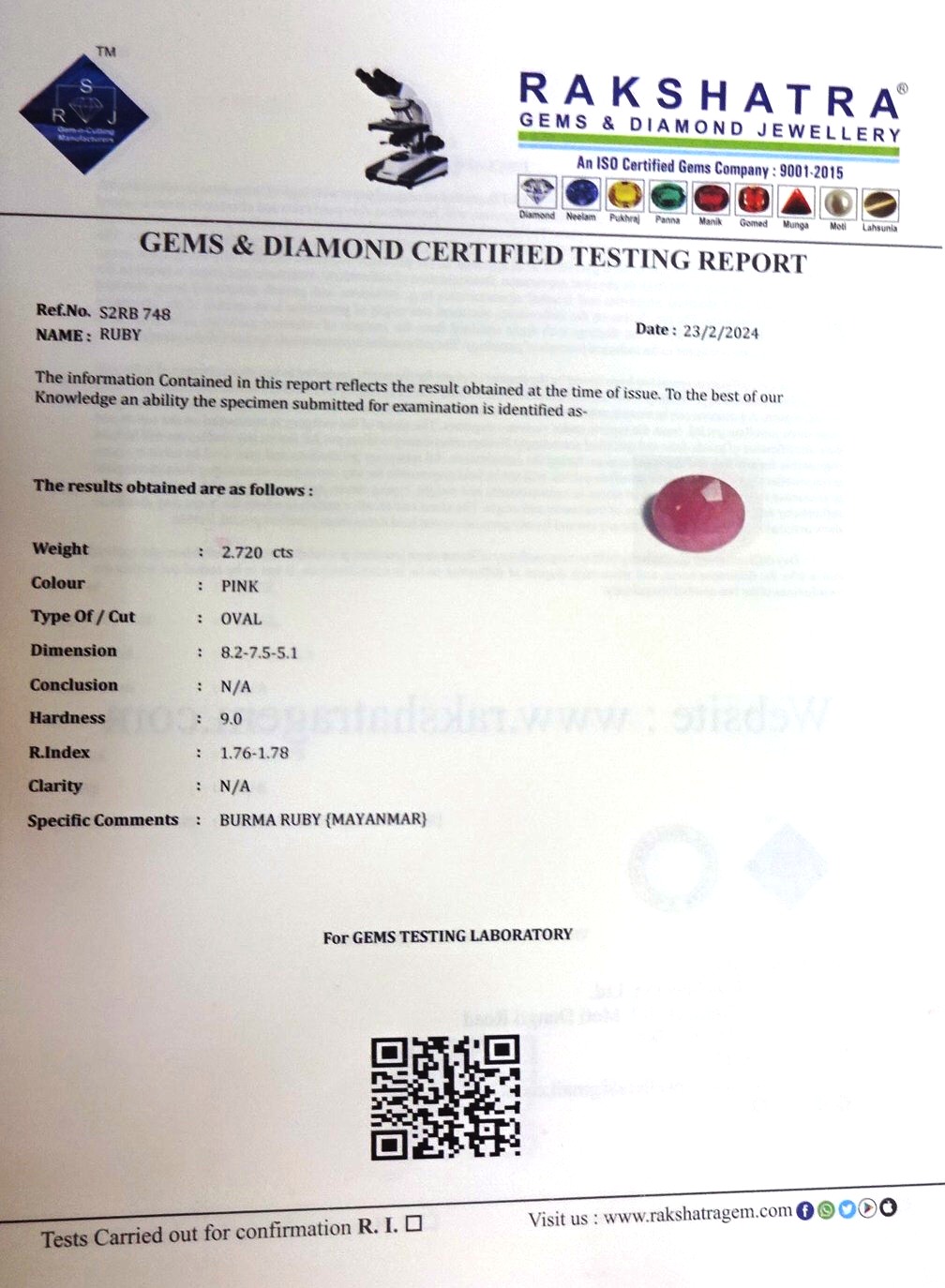 | SPECIFIC COMMENTS: | BURMA RUBY {MAYANMAR} |