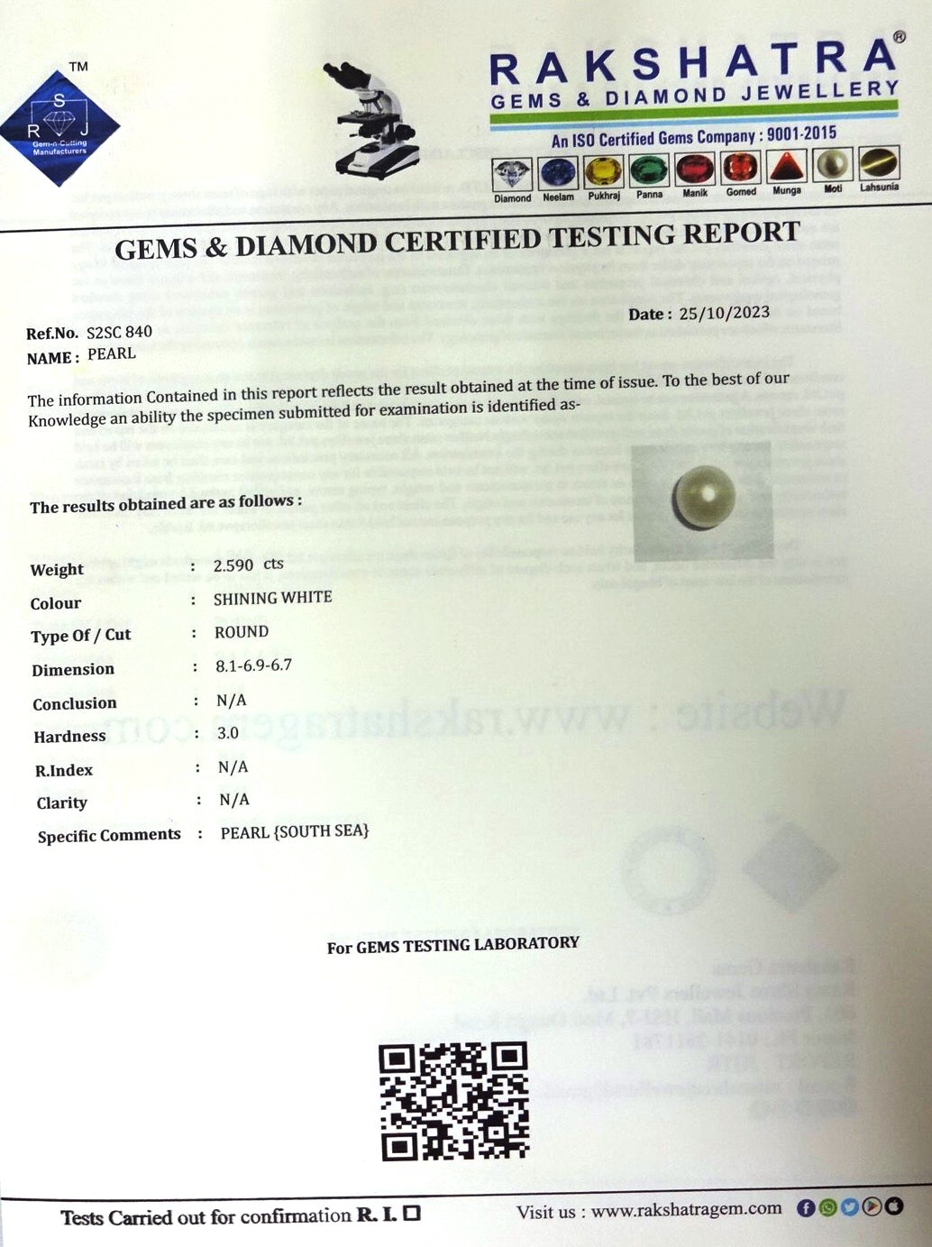 | SPECIFIC COMMENTS: | PEARL { SOUTH SEA } |