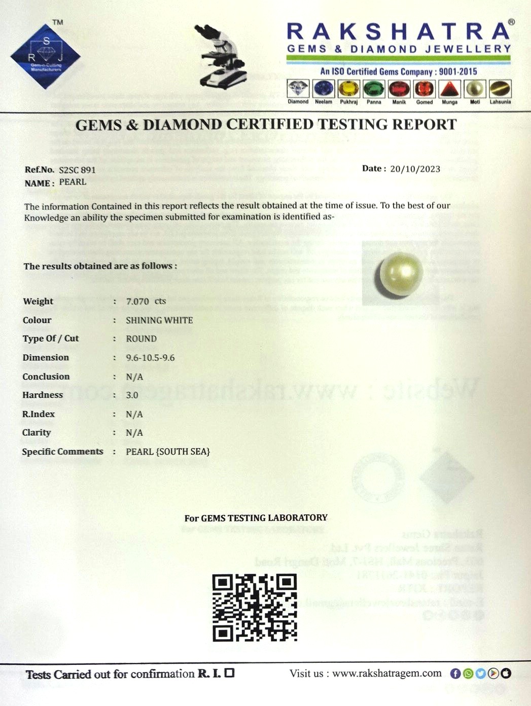 | SPECIFIC COMMENTS: | PEARL {SOUTH SEA} |