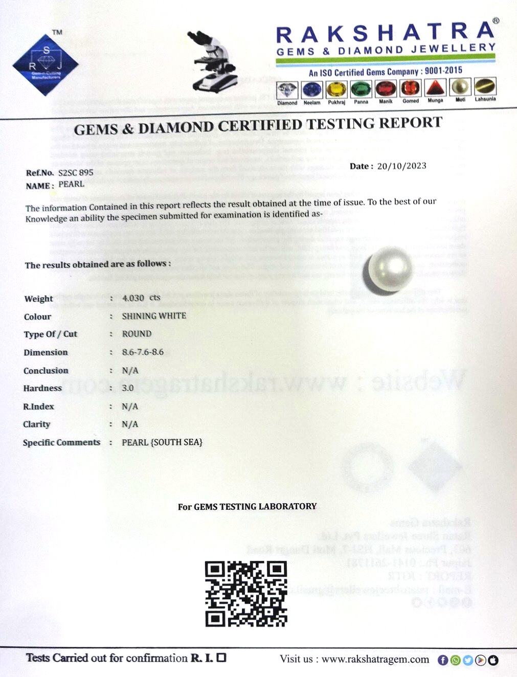 | SPECIFIC COMMENTS: | PEARL {SOUTH SEA} |